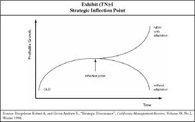 Andy Groves begins his classic with the Schumpeter quote that it is not price competition, but the new commodity or technology that strikes at the foundation of existing firms. At that time Andy was teaching strategic management at Stanford. With time, the rules - environment change and these changes sneak up on leaders. The ability to recognize that the winds have changed before the boat is wrecked is important. Back in my boating days we would boat in my 18 footer from Hood Canal up to the San Juan Islands on a sunny windless day and camp overnight. The following day would often be cloudy and windy making the trip back hazardous. He notes you would like to detect significant changes earlier by being mindful of especially your organizations periphery. Like Nonaka, he points out that middle management are often the first to note the change and it their job to inform leadership. He warns to be careful not to inhibit this through fear by middle management of punishment. When confronted with change managers go through denial, anger, bargaining , depression , acceptance. Senior managers try to escape through diversions such as acquisitions. There is what he calls inertia of success otherwise known as the competency trap in which businesses continue what has been successful.